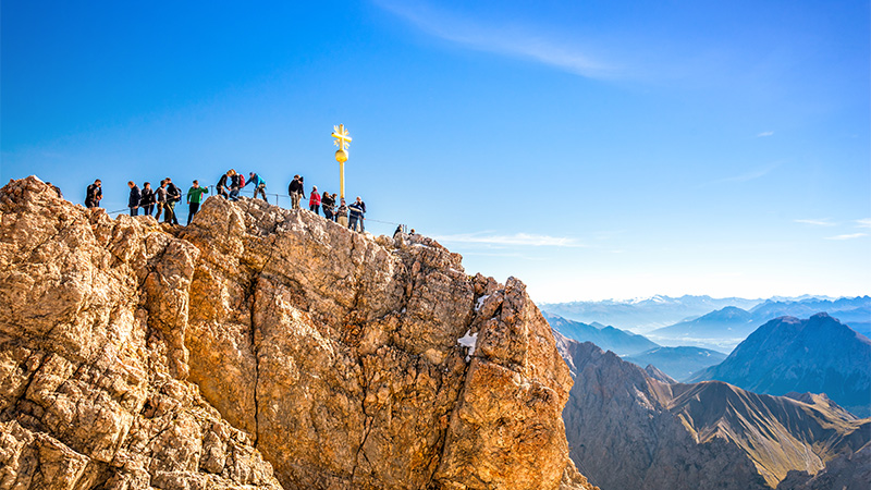 En mil längre söderut stiger vi på en stor kabinbana som på några minuter tar oss upp till Zugspitze, med 2 962 meter landets högsta berg. Sitt första gyllene kors, ett populärt fotomotiv, fick toppen för drygt 150 år sedan. Vid klart väder kan vi blicka bort mot fyra länder och 250 km bort!