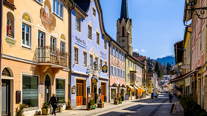 Vi gör en stadspromenad på Garmisch-sidan och kan beundra otaliga fina, färgglada hus med konstfulla fasadmålerier och blomsterprakt på balkonger.