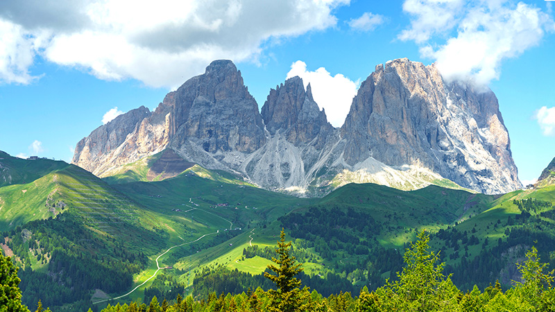 Dessa sägenomspunna kalkstenskedjor, som under miljontals år formats av naturen till fantastiska konstverk, kallades av befolkningen länge för ”de bleka berg”. Genom natursköna dalar, vackra byar och flera bergspass tar vi oss runt i Dolomiternas hjärta. Höjdpunkten under denna upplevelserika dag väntar på Pass Pordoi, den Stora Dolomitvägens högsta ställe. Härifrån bjuds vi på enastående naturscenerier och i den sköna bergsluften smakar säkert fika eller lunch alldeles extra.