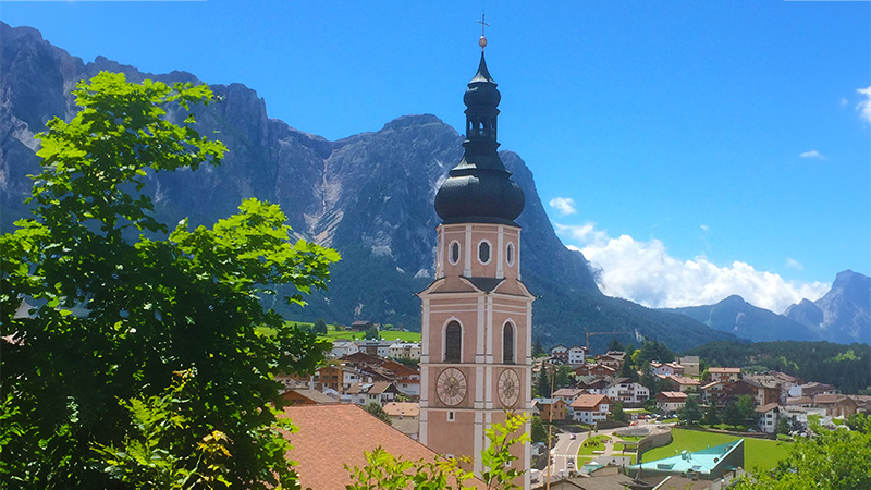 Kastelruth har det markanta Schlern-massivet som bakgrundskuliss. Ett ovanligt högt klocktorn tronar ovanför stadens lilla torg, smala gränder och fina byggnader med dekorativa fasadmålningar.